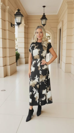 Stay on trend this season with our Black Abstract Print Flutter Sleeve Midi Dress. Featuring a round neck, flutter sleeves, and elasticated waist back, a zip up back and a midi length skirt with a side split. Pair it with boots for the day or dress it up with some strappy heels for a cute evening look.