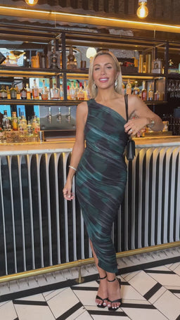 Our Teal And Black Smudge Print Mesh One Shoulder Asymmetric Hem Midi Dress is perfect for showing off those curves. Made from our gorgeous lined mesh fabric, it features a one shoulder top design, ruched detailing and an asymmetric hem. Team it with strappy heels and a clutch for a super versatile look perfect for all your special occasions.