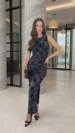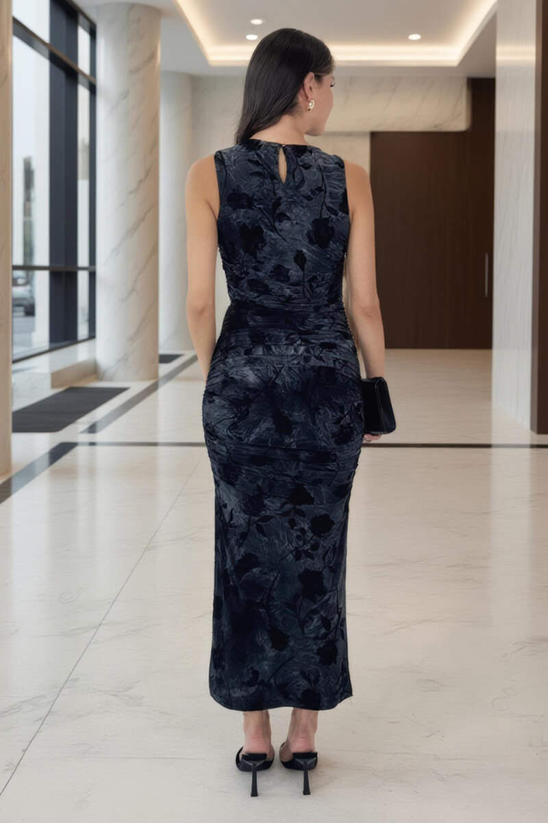 Embrace sophistication and romance in our Black And Grey Velour Rose Detail Bodycon Midi Dress. Crafted from a soft, stretch fabric, it features delicate velour rose detailing set against a smoky grey base, a form-fitting silhouette, mini slip lining, a sleeveless top with a round neckine, a back neck loop closure, and a ruched skirt with side. Style it with strappy heels and a cute clutch for your next glam event.