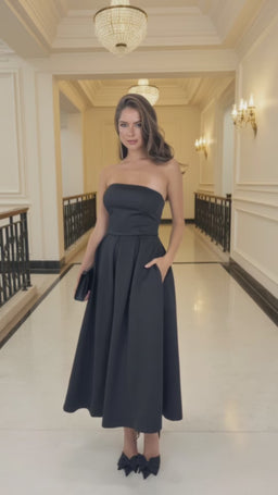 Look and feel gorgeous in our flattering Black Bandeau A-Line Skirt Midi Dress. Featuring a fitted strapless top with rubber facing, a zip up back and a flowy a-line midi skirt with pleated detailing. Wear this glamorous piece with court heels and some statement jewellery for a stunning event look.