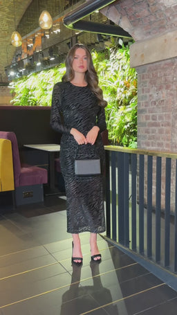 Turn up the charm in our chic Black Velvet Zebra Striped Overlay Long Sleeve Midi Dress. Crafted from a stretch, sheer fabric with embossed velvet zebra stripes, this dress features a bodycon silhouette, attached midi length lining, a round neck, long sheer sleeves, and a ruched maxi length mesh skirt with side split.. Pair it with some statement jewellery and heels for a glamorous party season look!