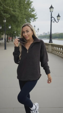 Our Chocolate 1/4 Zip Teddy Sweatshirt is a trendy winter season must-have. Featuring our warm, super soft teddy material and a funnel neck with a 1/4 front zip. Layer it on top of your favourite winter outfit for a casual day look or use it as lounge wear for a cosy day.