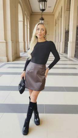 Add a touch of modern sophistication to your wardrobe with our Chocolate Faux Leather Mini Skirt. Featuring our premium faux leather material and a zip-up back. Wear this mini with a cute jumper and our matching faux leather jacket for a sleek, put together look.