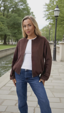 Chocolate Faux Suede Bubble Hem Bomber Jacket