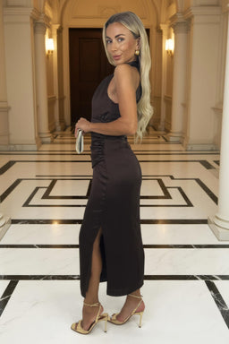 Stand out from the crowd in our gorgeous Chocolate Halter Neck Draped Waist Midi Dress. Crafted from our gorgeous satin-feel fabric, this dress features a halter neck with pleated detailing, a draped waist detail with side ruching, a zip up back and a midi skirt with a side split. Complete the look with some statement earrings and some cute heels.