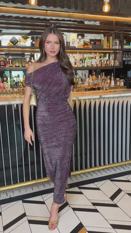 Plum Sparkle Off The Shoulder Draped Top Midi Dress