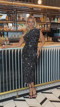 Get ready to steal the spotlight in our Silver Velvet Sequin Round Neck Midi Dress. This festive wardrobe staple features all over velvet sequin fabric, full lining, a fitted silhouette, a round neck, cap sleeves with shoulder pads, a zip-up back and a midi length skirt with a side split . Pair it with some heels and your favourite accessories for the perfect Christmas party look.